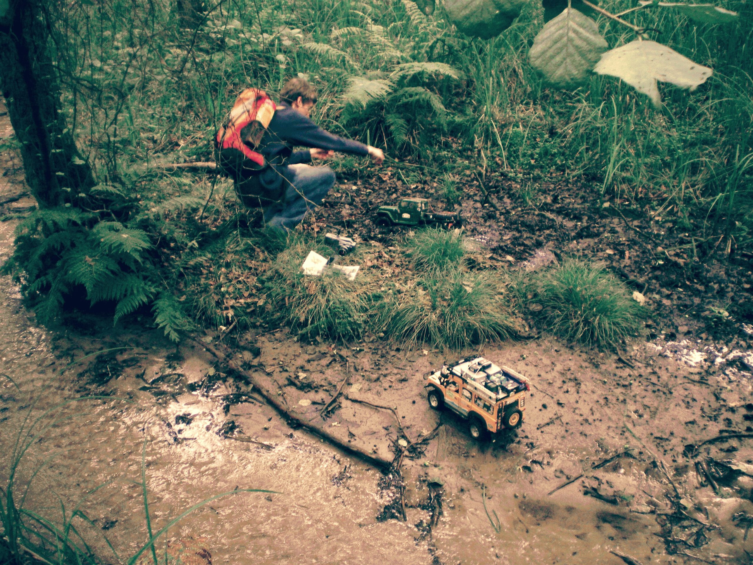 Mein Holz-Camel-110 hatte genau an dieser Stelle einen Getriebeschaden. Die Stunde in der die anderen abgeseilt wurden reichte, um dem Tamiya-XC mehrere Schrauben durch das Chassis zu verpassen, um mehr Druck auf die Zahnräder zu bekommen. Das hintere Diff musste ebenfalls repariert werden.
